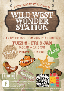 KIDZ KLUB (primary age): 9:30 am to 12:30 pm Tuesday 6th to Friday 9th January 2026 Download flyer by clicking the image.